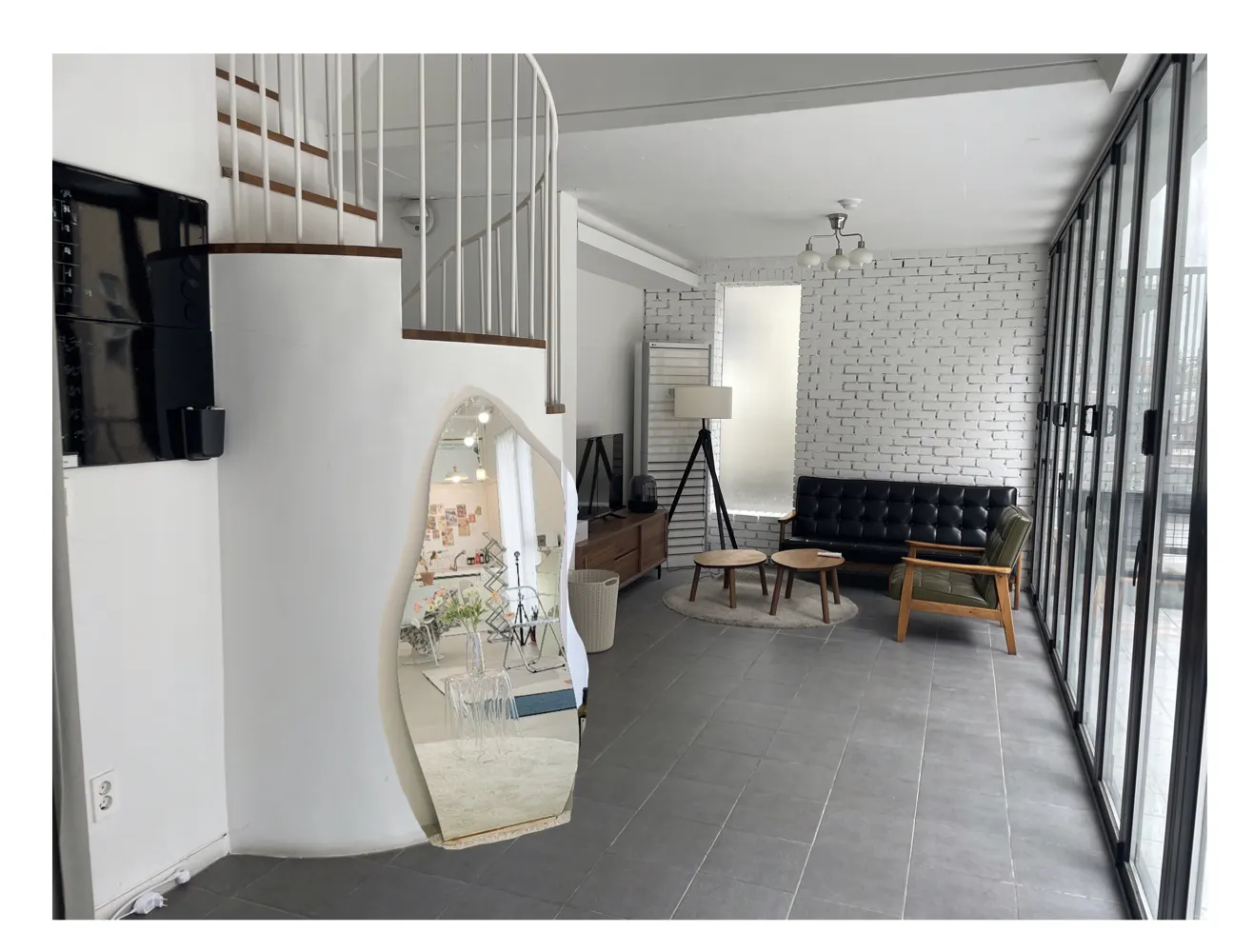 전신거울 —> 공유 거실 옆 올라가는 계단이 너무 휑~해서 펑크스테이션 분들이 외출할 때 fashion check 하고 갈 수 있는 전신거울 두기